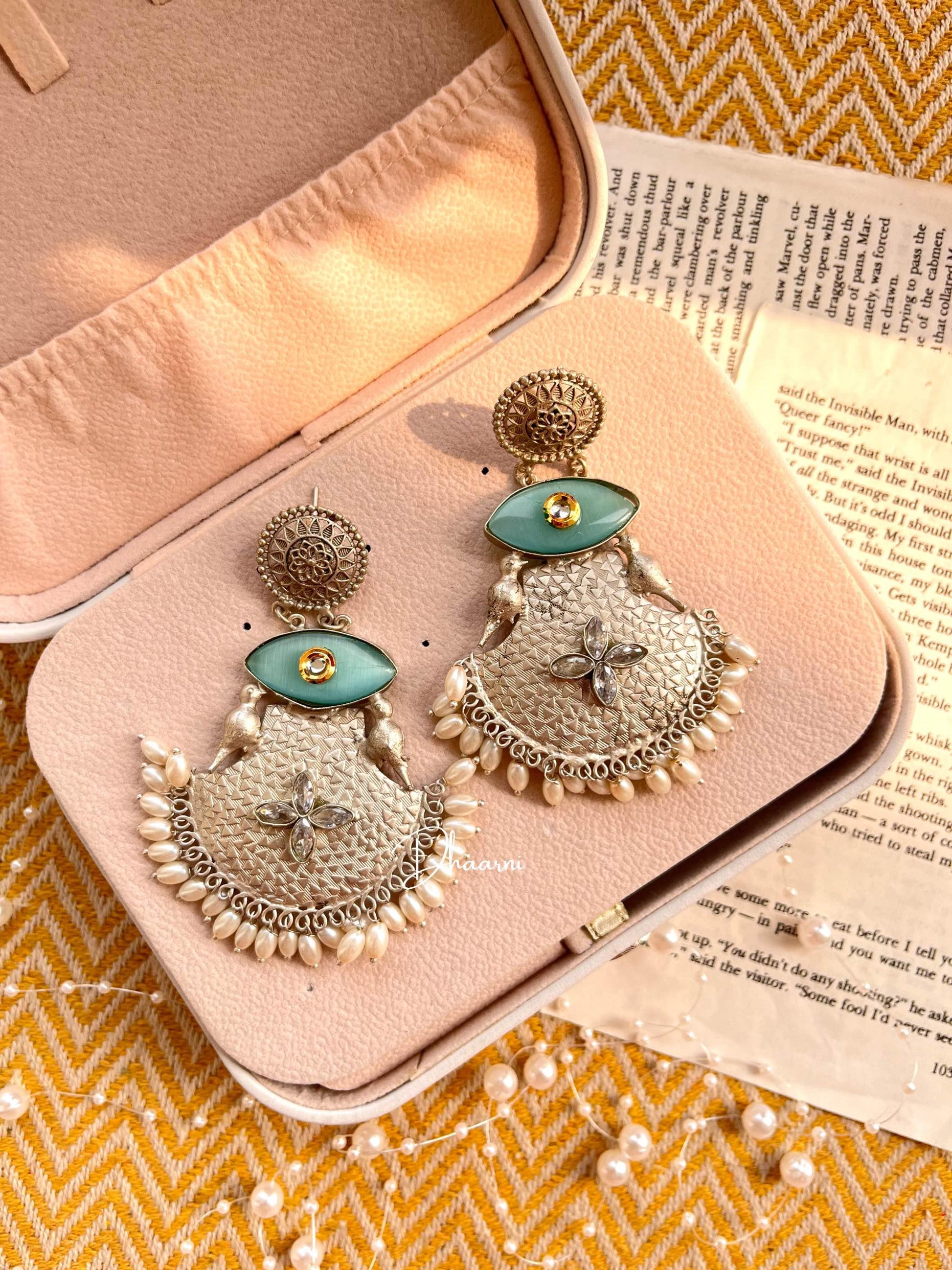 "Enhance your look with our Dhara Blue Silver Coated earrings. These ethnic premium earrings feature a unique silver coating, adding elegance and sophistication to any outfit. Made with high-quality materials, our earrings are a must-have for any fashion-forward individual. Elevate your style with Dhara."