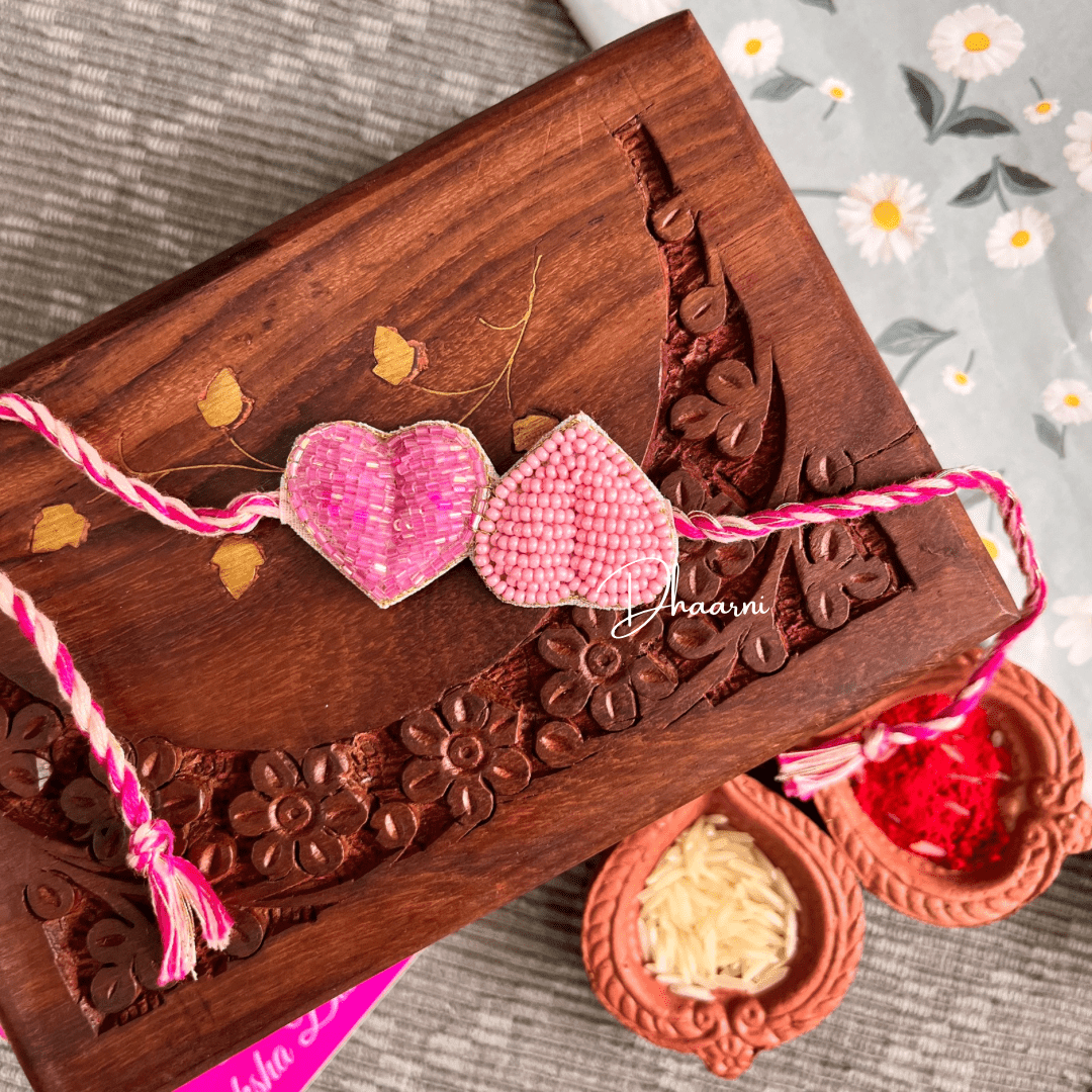 Elevate the bond with your sister with the Do Dil Rakhi in Pink. This double heart pink Rakhi signifies the love and affection between siblings. Show her how much she means to you with this beautiful and meaningful Rakhi. Available now for a limited time only.