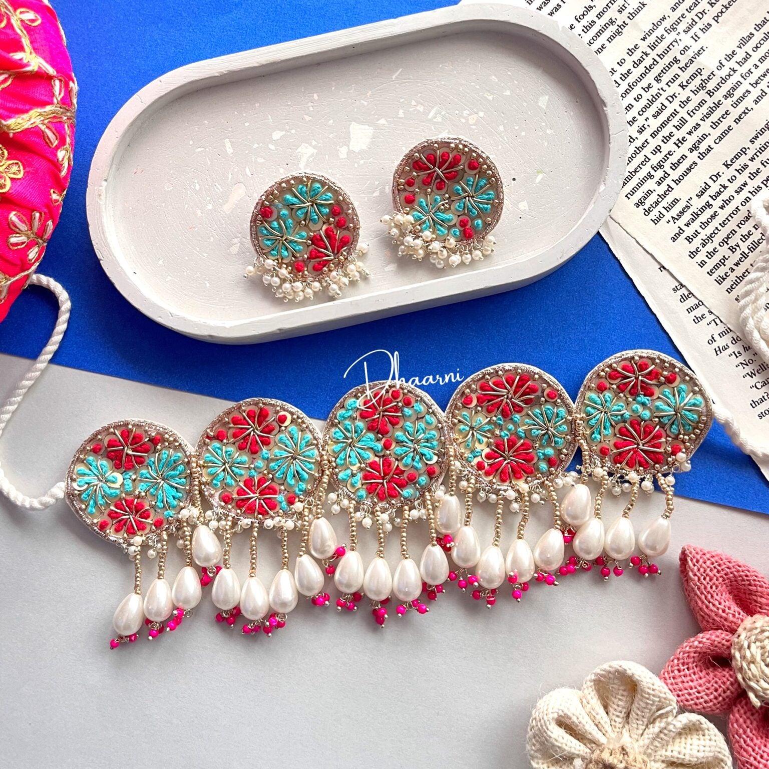 The Golden Tulip Blue Choker with earrings is a premium piece featuring vibrant haldi mehendi blue dardoji decorations. Perfect for adding a pop of color to any outfit, this choker and earrings set is sure to make a statement. Made with high quality materials, it is a must-have for any fashion-forward individual.