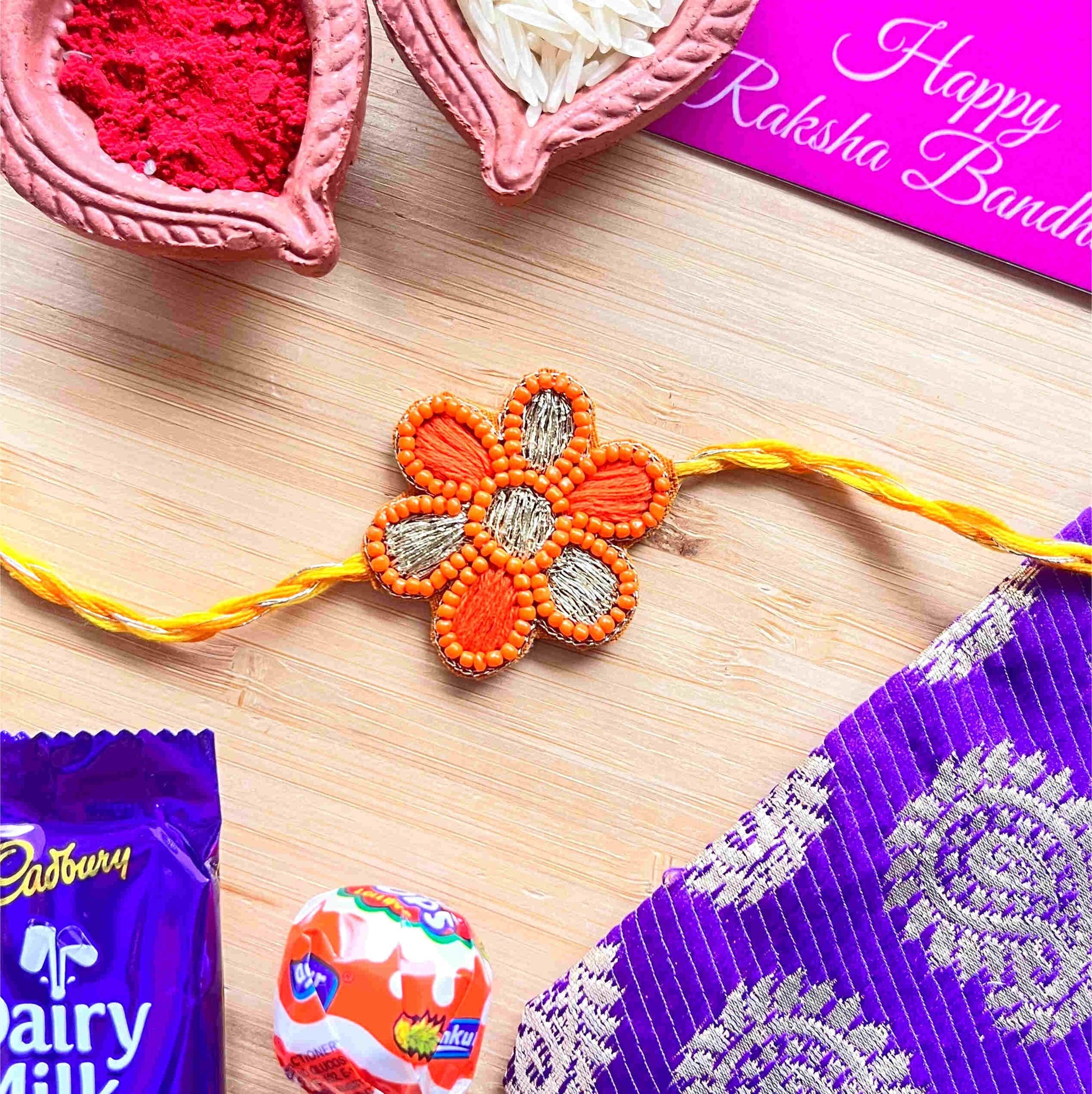 This beautiful Shubh Labh Rakhi features an orange colour and is made with resham material. With traditional symbols of prosperity and auspiciousness, this rakhi is perfect for celebrating the bond between siblings. Show your love and good wishes with this intricately designed rakhi.